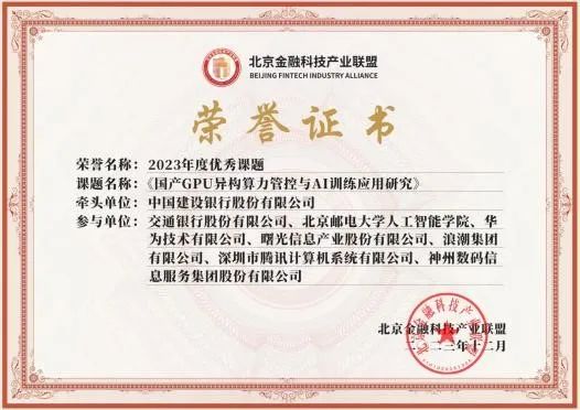 近期,北京金融科技产业联盟2023年度会员代表大会在京成功举办。中国人民银行科技司、中国人民银行北京市分行、北京市地方金融监督管理局相关领导出席会议。作为联盟单位,PG电子信息凭借在金融数字化领域突出贡献和相关成绩,获评联盟“年度优惠会员单位”“年度积极贡献单位”“年度优秀专家”等荣誉,并且参与由中国建设银行牵头的《国产GPU算力管控与AI训练应用研究》课题,PG电子信息获评“2023年度优秀课题”荣誉。