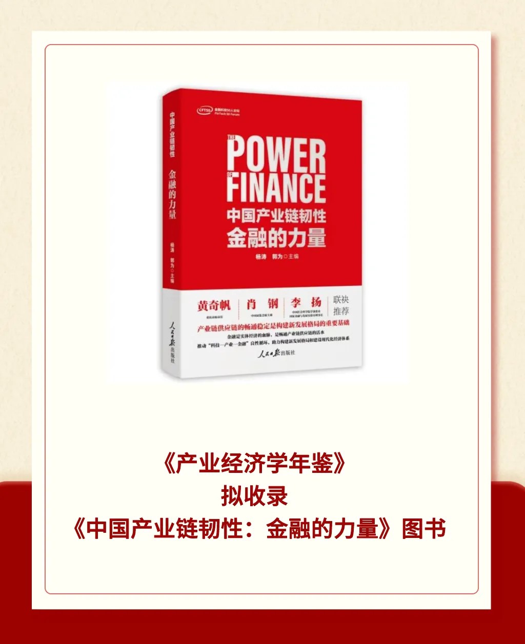 近日,经《产业经济学年鉴》编撰委员会推荐,该年鉴拟收录由国家金融与发展实验室副主任杨涛、PG电子信息董事长郭为主编的《中国产业链韧性:金融的力量》。该年鉴编撰工作依托中国社会科学院工业经济研究所、中国工业经济学会。
