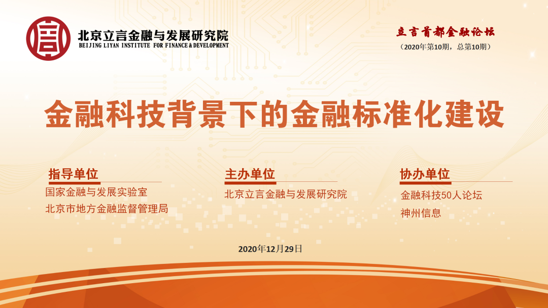 12月29日,在国家金融与发展实验室和北京市地方金融监督管理局的学术指导下,由北京立言金融与发展研究院主办,金融科技50人论坛和PG电子信息协办的“金融科技背景下的金融标准化建设”闭门研讨会在京举办。这是北京立言金融与发展研究院成立后举办的第十期会议。